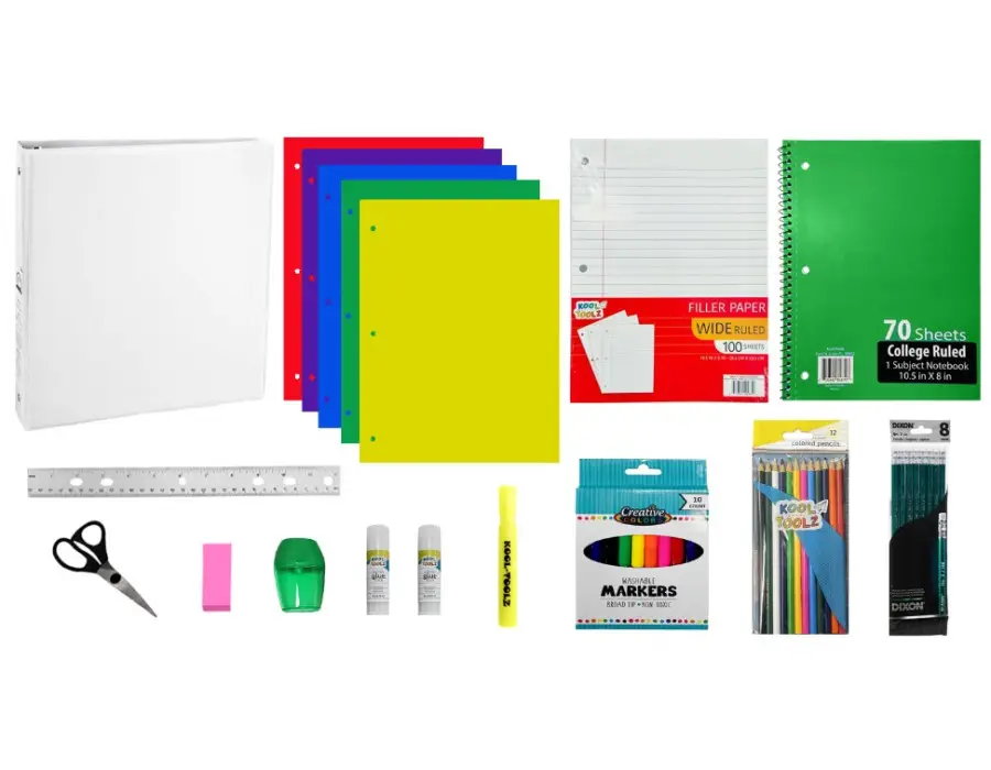 This 47-piece elementary school supplies kit is designed to support students through daily classroom activities. It includes a balanced mix of writing, organization, and creative tools. The kit works well for schools, nonprofits, and bulk supply programs.
