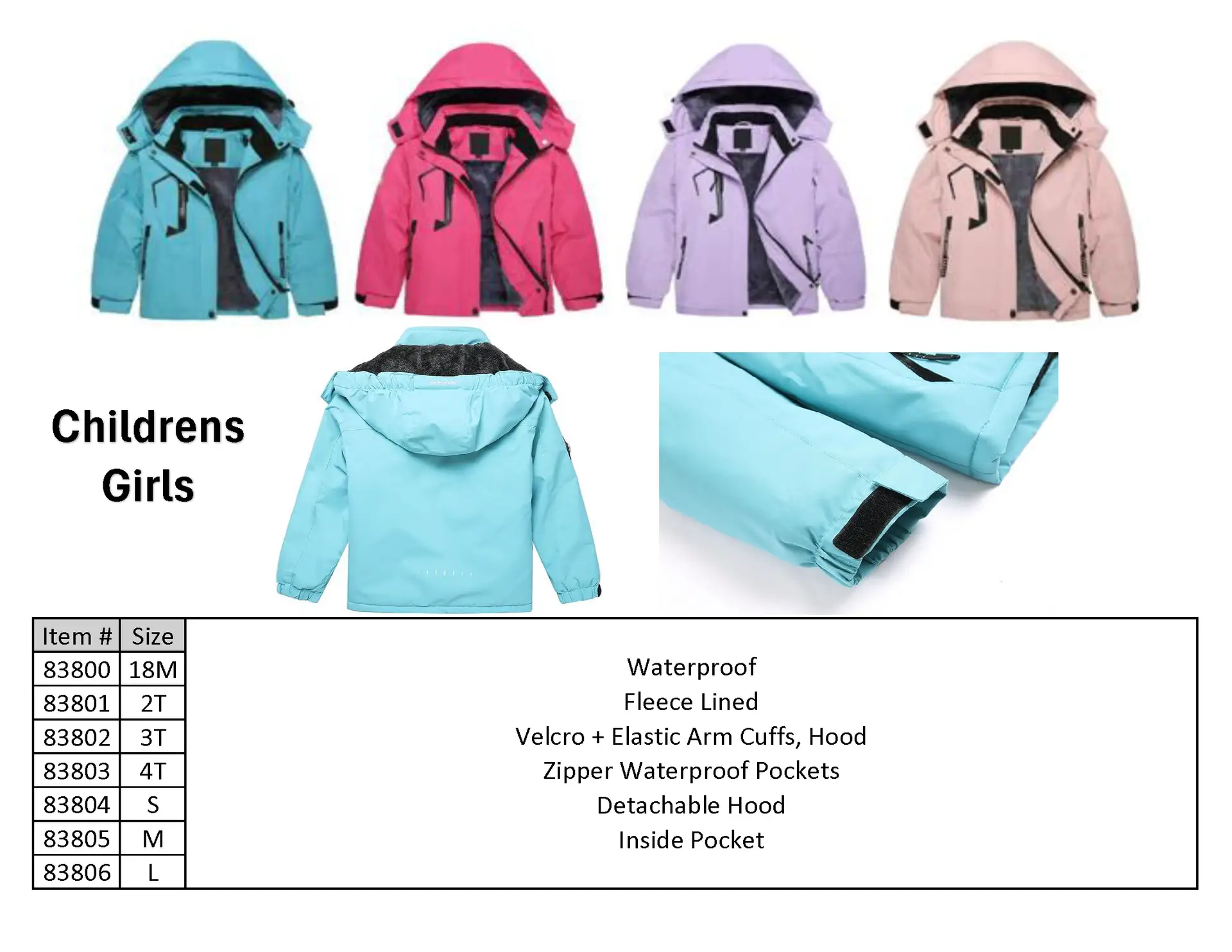 Warm, waterproof girls’ winter coats in assorted colors. Fleece-lined with hood, velcro/elastic cuffs, and kid-friendly durability.